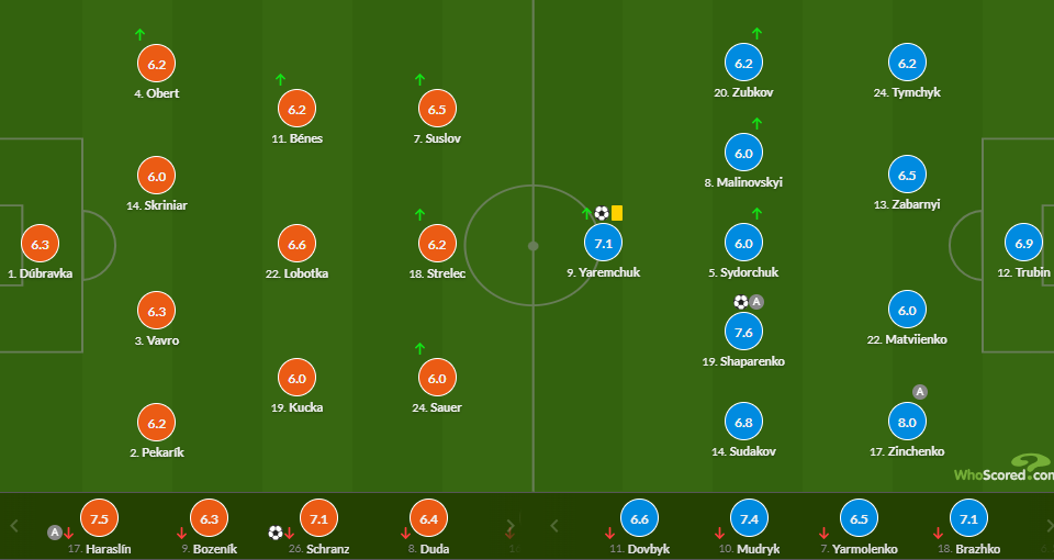 斯洛伐克(4-3-3):1-杜布拉夫卡;2-佩卡里克,3-瓦夫罗,14-什克里尼亚尔,16-汉茨科(677-苏斯洛夫);19-库茨卡,22-洛博特卡,8-杜达(6011-贝内斯);26-施兰茨(8624-索尔),9-博泽尼克(6018-斯特雷莱茨),17-哈拉斯林(674-奥伯特)