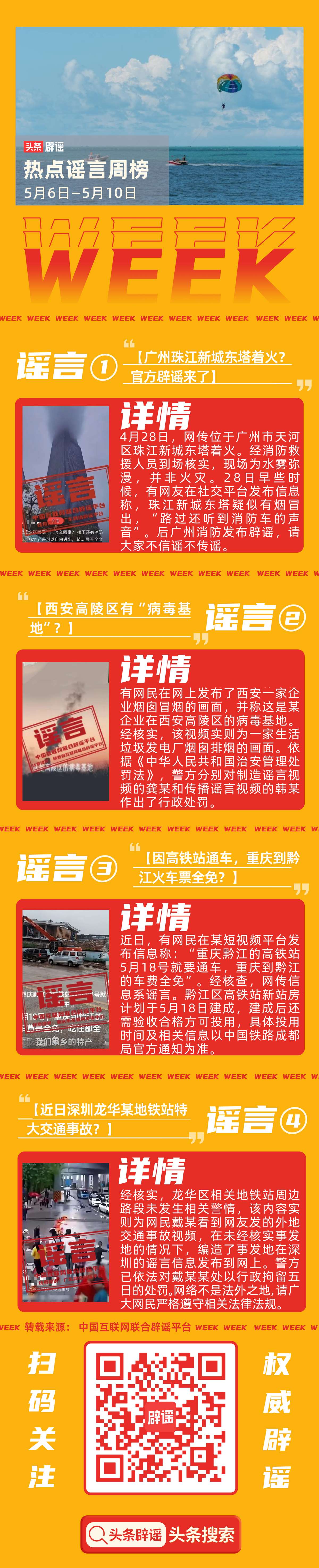 此外,本周还有“西安高陵区有‘病毒基地’”“因高铁站通车,重庆到黔江火车票全免”“近日深圳龙华某地铁站特大交通事故”等不实消息流传。