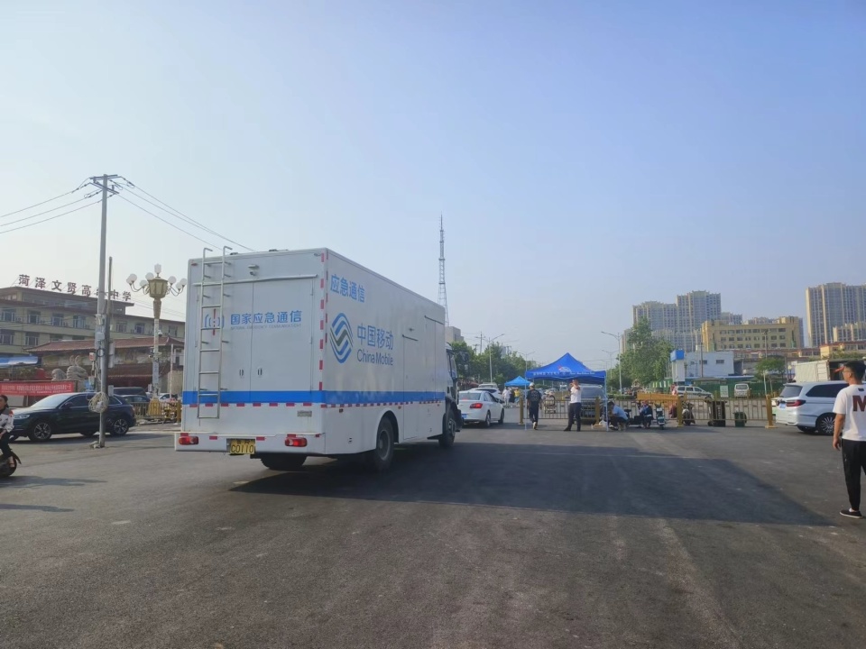 一辆中国移动应急通信保障车正驶离菏泽南站。图/九派新闻彭茸雯
