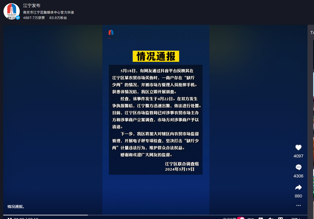 5月19日,江宁区联合调查组发布情况通报:5月18日,有网友通过抖音平台反映其在江宁区某农贸市场买鱼时,一商户存在“缺斤少两”的情况,并被市场方管理人员抢摔手机。获悉该情况后,我区立即开展调查。