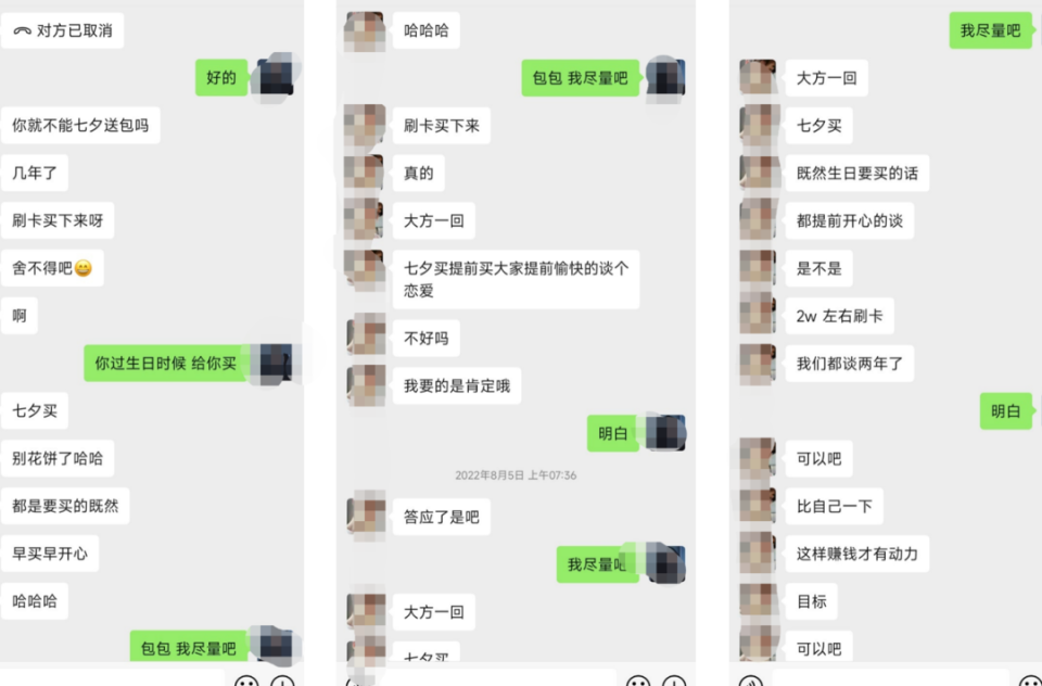 阿明按要求到商场购买26800元包包,约定次日送给女方,再一起逛街吃饭。但约会当天,女方以“陪亲戚走不开”为由爽约,谩骂、恳求一整天,要求阿明深夜把包送到楼下,“我扔垃圾的时候顺便拿”。
