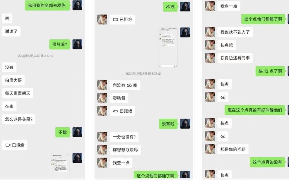 阿明几次深夜发来照片,称自己在工地干活,或者正在开会、在跟领导谈话,让女方“稍等下”。这种情况下,女方常见回复是“有时间打字,没时间付款”“你是不是死了,墨迹得像女人”。这样的催要会持续数小时,甚至连续几天。