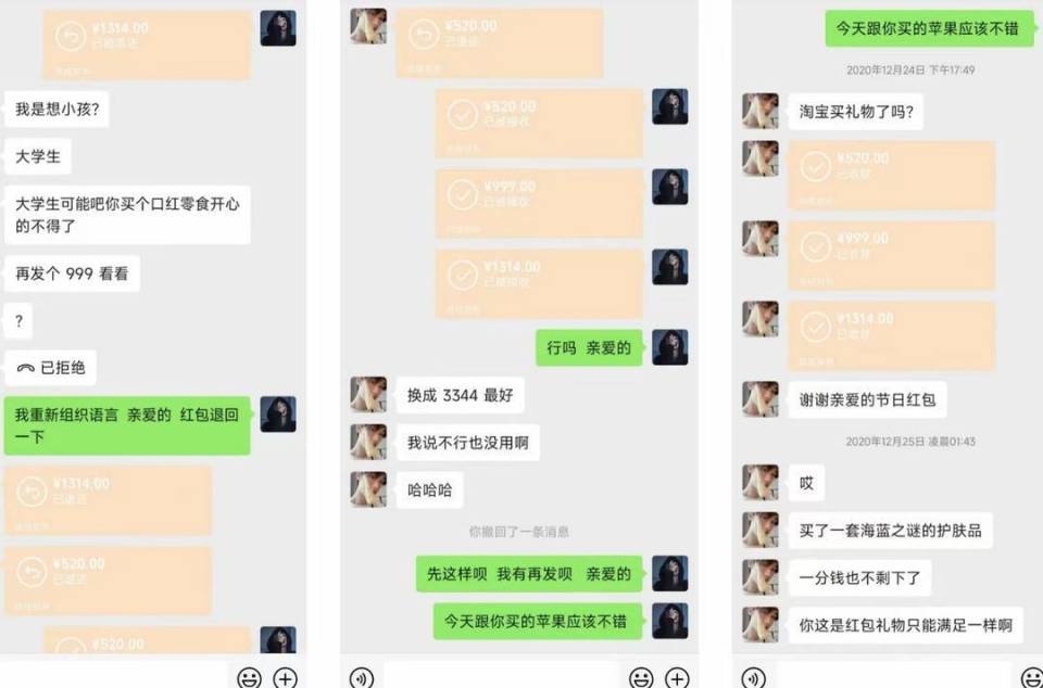 女方收到钱款后,总是回复一句“谢谢亲爱的红包礼物”。即便前一句话还在谩骂,即便“感谢”之后会立即继续谩骂。