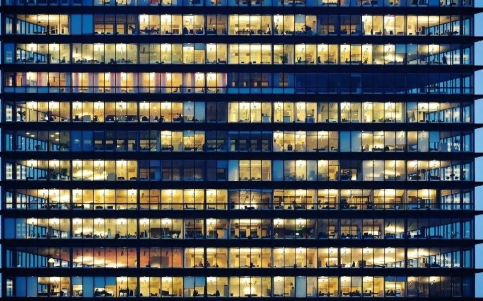 灯火通明的办公室大楼 图源:“央视网”微信公众号