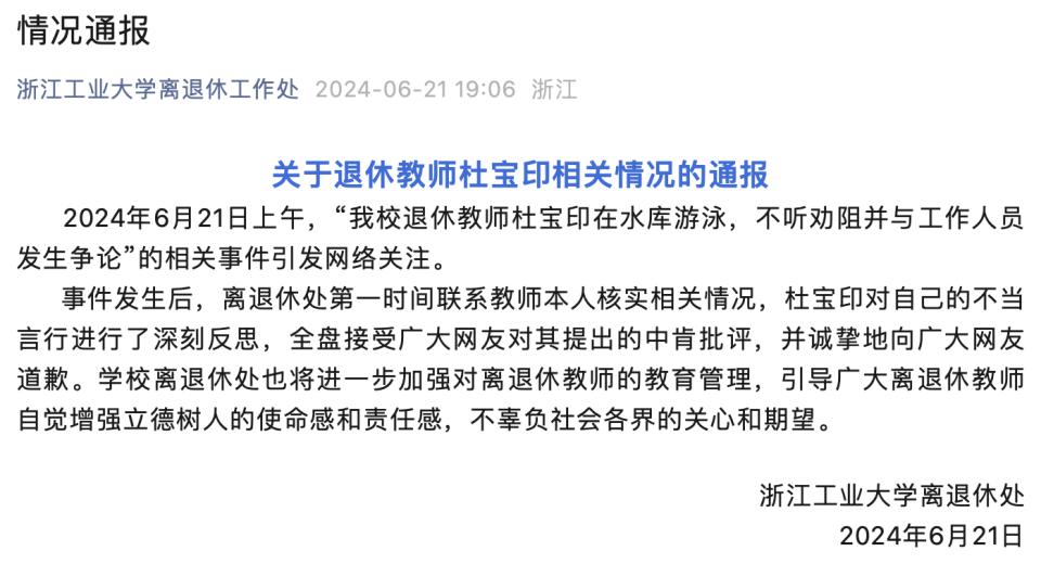6月21日,浙江工业大学离退休处发布通报称,“我校退休教师杜宝印在水库游泳,不听劝阻并与工作人员发生争论”的相关事件引发网络关注。