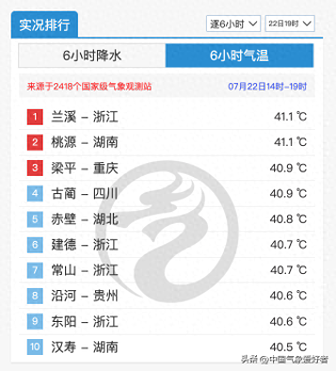 7月22日,我们迎来了24节气中的大暑节气,和节气相对应的是,今天我国中东部地区的炎热进一步加剧,晚上19时,6小时气温排行榜上可见,南方多个省区市出现了40度以上的高温,40度省份是今年以来最多,在这当中,杭州国家站气温升至40.1度,是今年首次冲上40度、也是继海口福州之后南方第三个出现40度的省会城市。此外江苏常州、江阴最高气温分别达到40、40.1度,是江苏全省今年首次出现40度。 ??