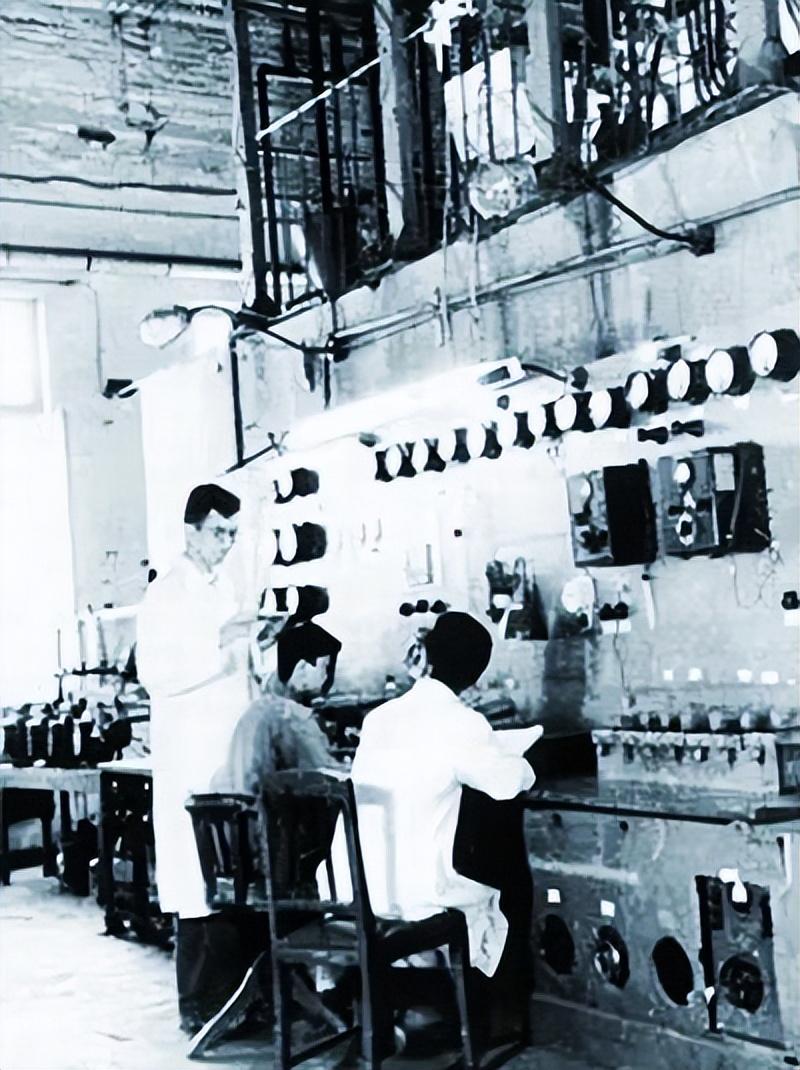 △张存浩(左一)在实验室进行水煤气合成液体燃料实验。