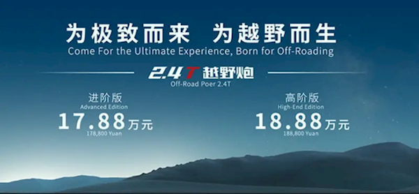 长城汽车在2024年成都车展上发布了其新款2.4T越野炮车型,并宣布该车已正式上市。此次上市的越野炮共有两款车型,起售价为17.88万元。