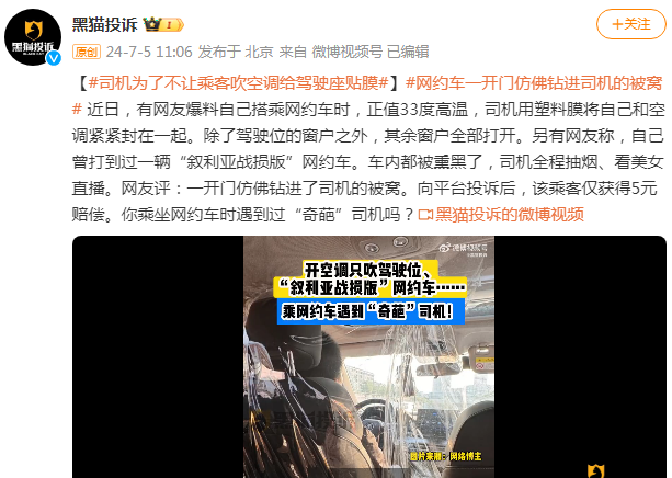 近日,有网友称自己搭乘网约车时,室外33度高温,司机精心为驾驶座包上塑料膜,将自己和空调封在一起。除了驾驶位窗户之外,其余窗户全部打开。